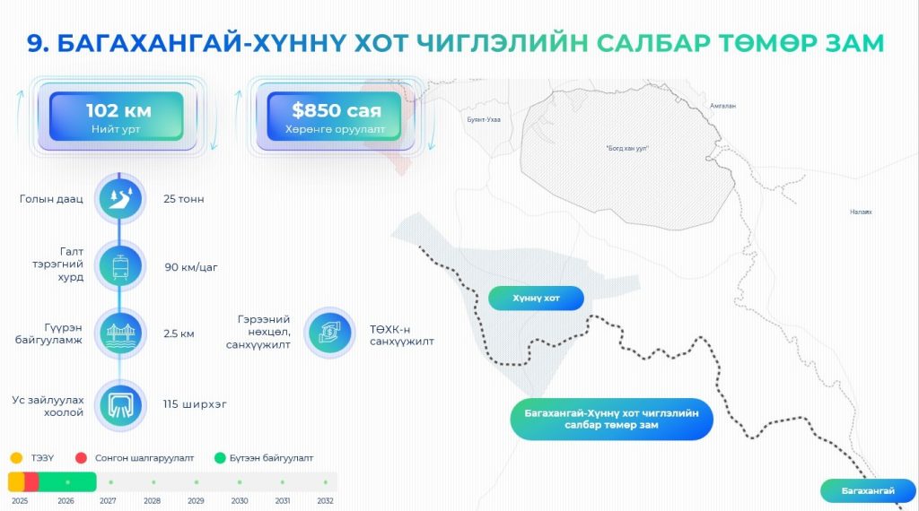Улаанбаатар хотыг хөгжүүлэх 24 мега төслийн хүрээнд Багахангай-Хүннү хот чиглэлийн салбар төмөр зам барина. Уг төмөр зам нийт 102 км үргэлжилнэ. Төмөр замын голын даац 25 тонн, гүүрэн байгууламж 2.5